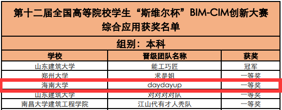 2021年5月22日,第十二届全国高等院校“斯维尔杯”BIM-CIM创新大赛圆满落幕。本次比赛由中国建设教育协会主办、深圳市斯维尔科技股份有限公司承办,累计报名院校400多所,参赛队伍1600多支,受到广大建筑类院校师生的热烈响应。本比赛推动了BIM、CIM技术在高等院校的教学与应用,为建设行业信息化发展培养了BIM、CIM技术创新型和复合型人才,成为工程造价和工程管理专业最具影响力的比赛之一。本届大赛分为BIM建模、专项应用和综合应用三个赛项,从不同方面考察个人技能和团队协作能力。由于疫情总体防控原因,本次比赛依然采用线上形式,通过腾讯会议进行线上监测,维护比赛公平性,并增加了“线上答辩”和“正向一体化应用”等创新型举措,得到了高校老师和专家的高度认可。我院代表队“daydayup队”以曹新颖老师为指导老师,由工程管理2018级胡贝宁、李磊,土木工程2018级肖钧垚,建筑学2017级李雨晴,建筑学2018级唐娜五位同学组成,参加BIM建模、专项应用和综合应用三个赛项并取得优异成绩。在BIM建模赛项中,李磊、胡贝宁同学分别获得土建一等奖和土建三等奖;在专项应用中,获得绿色建筑分析专项二等奖、规划与设计专项一等奖、工程造价专项冠军奖和工程管理专项冠军奖;在综合应用中,获得本科组一等奖。恭喜我院代表队取得的优异成绩,并预祝我院同学再创辉煌!(图文:海南大学BIM协会)