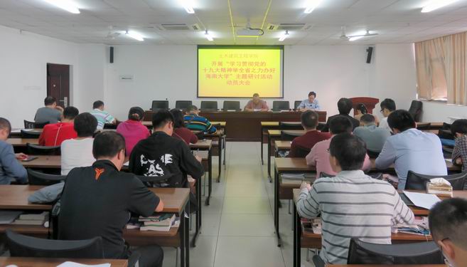 (一)学习动员。2017年11月30日,召开全院教职工大会,传达学习《中共海南大学委员会关于开展“学习贯彻党的十九大精神,举全省之力办好海南大学”主题研讨活动实施方案》、学校党委二届二次全会精神和《中共海南大学委员会关于学习宣传贯彻党的十九大精神的实施意见》,动员部署学院主题研讨活动。