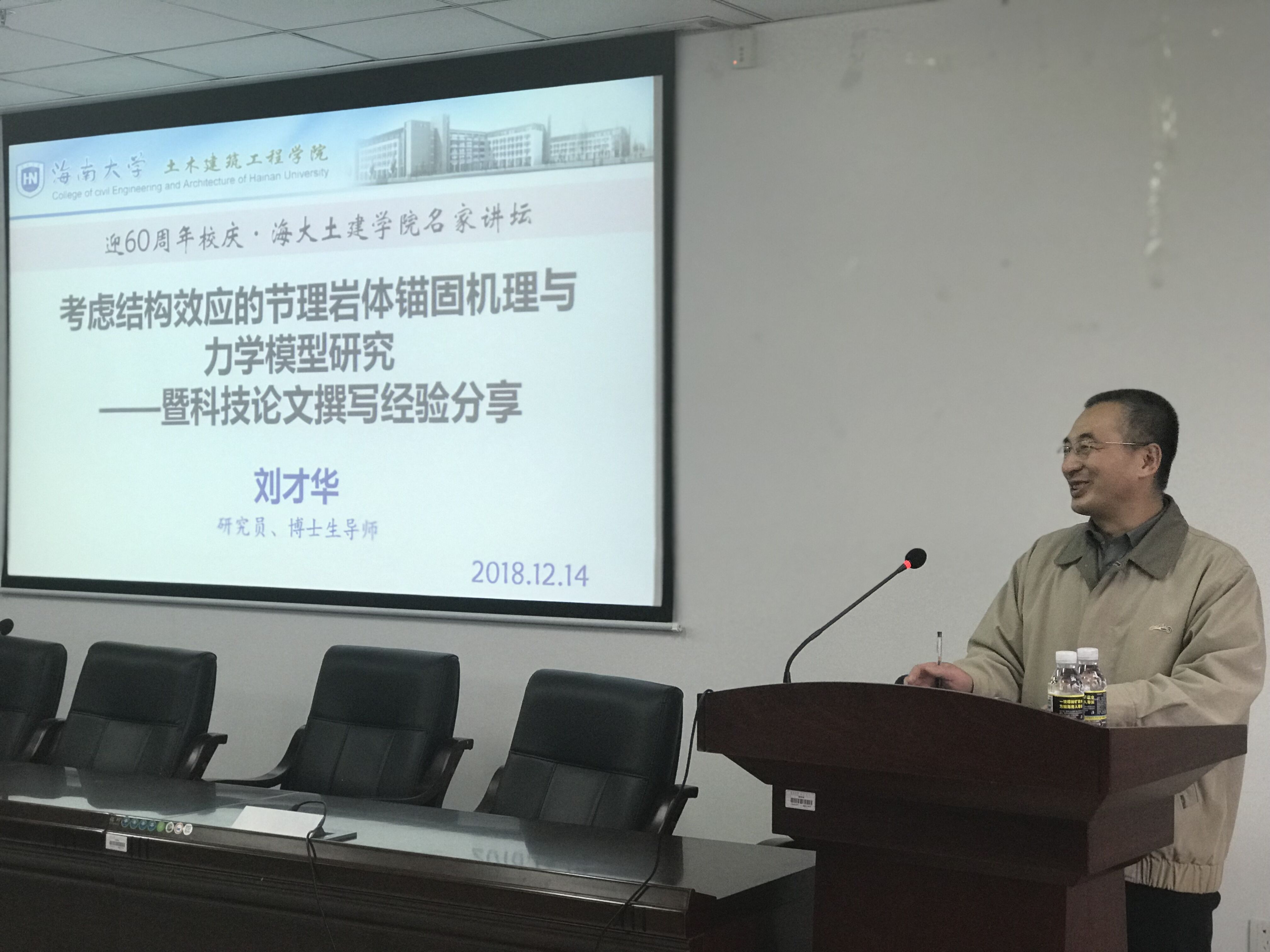 2018年12月14日下午3点,值海南大学迎60周年校庆之际,我院邀请中国科学院武汉岩土力学研究所刘才华研究员为我院师生作学术报告,报告题目为《考虑结构效应的节理岩体锚固机理与力学模型研究——暨学术论文撰写经验分享》。讲座由学院院长曹宝珠教授主持,学院张友良教授、岩土工程教研室全体教师、全体研究生及部分保研本科生参加了本次学术活动。