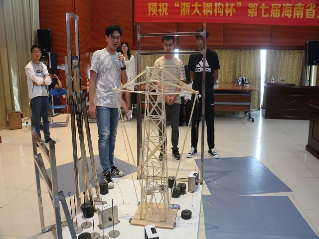 经过6月7日、8日两天16个小时的模型制作后,模型加载暨决赛于6月9日在海南大学思源多功能厅进行。加载开幕式于8点整开始,出席开幕式的领导有海南省土木建筑学会理事长段晓农、海南省力学学会理事长李光范,海南大学党委常委梁谋副校长、海南大学土木建筑学院院长曹宝珠、海南大学土木建筑学院党委书记卢江海、海南大学william威廉亚洲官方副院长邱宙廷、海南浙大钢构有限公司常务副总陈炜,开幕式由海南大学william威廉亚洲官方副院长陈云主持。
