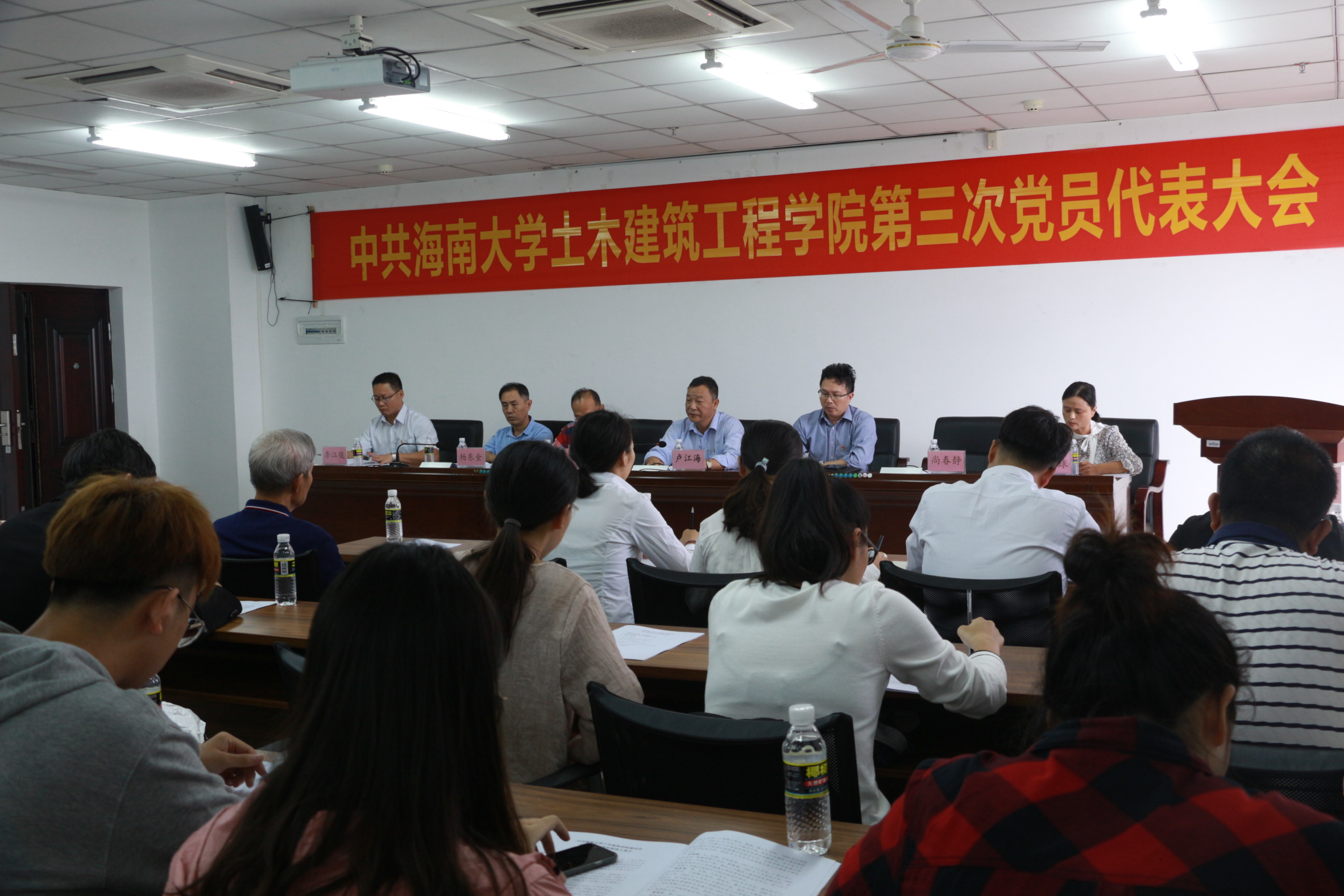 学院党委书记卢江海、党委委员邱宙廷、党委委员韩建刚、党委委员尚春静、党委委员杨东全、党委委员李江俊、学校特邀组织员、原海南大学理工学院党总支书记麦秀芬参加会议,参加会议的还有全院师生党员。罗邻球副书记主持会议。