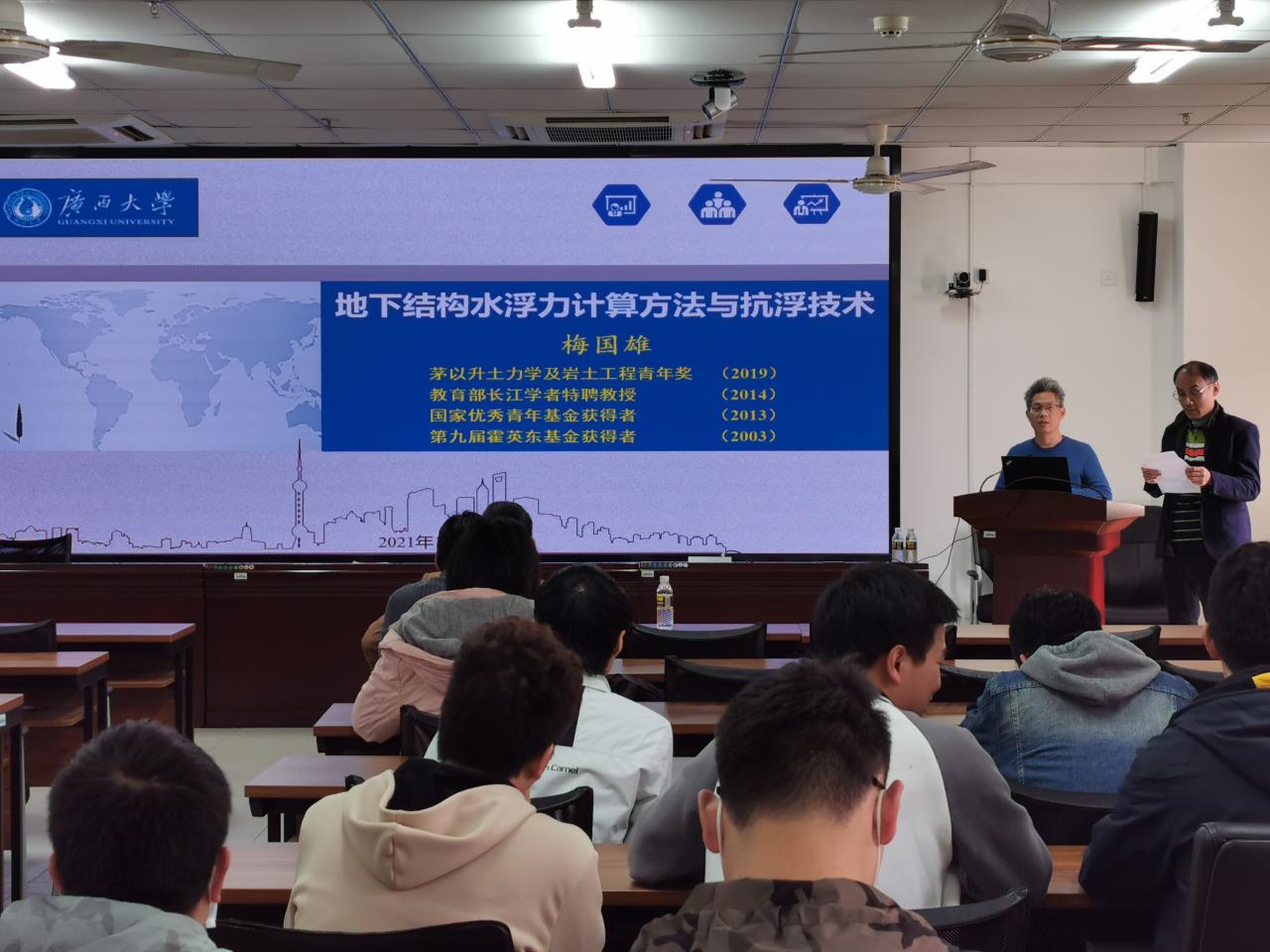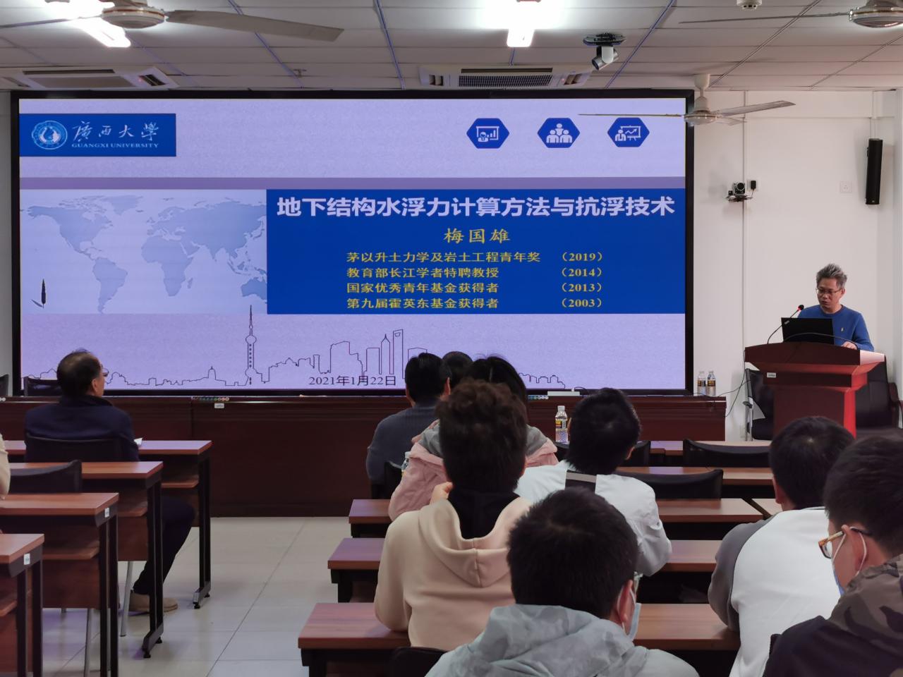2021年1月22(周五)下午2:00-3:00点广西大学工程防灾与结构安全教育部重点实验室主任梅国雄应我院周智院长的邀请,在海南大学研发楼510报告厅做《地下结构水浮力计算与抗浮关键技术》学术报告。报告会由张友良副院长主持,我院教师和研究生近30人参加了此次学术报告会。