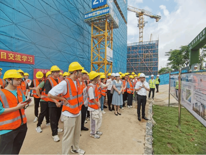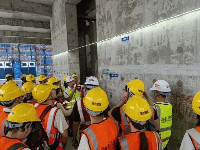 随后,学生们接受了进工地前的安全教育交底,确保在观摩过程中能够严格遵守安全规定。之后,一行人参观了项目党建文化阵地,感受到了项目团队在党建工作上的积极作为。项目负责人向学生介绍了海控”从严治党、清正廉洁”的作风要求和“兴廉政之风,树浩然正气”的企业精神和价值观,让学生对规范项目管理有了初步认识和体验。