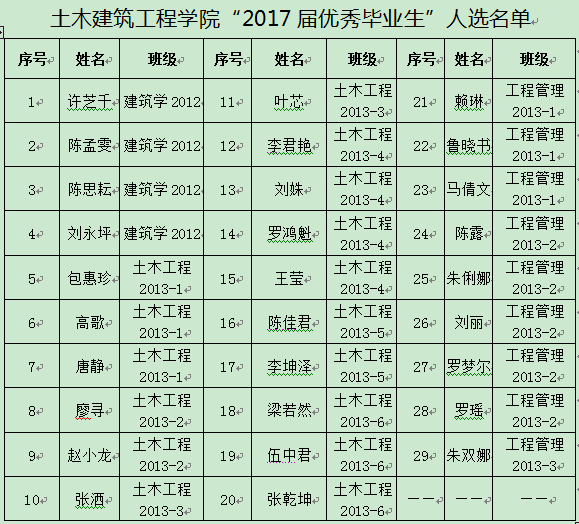 根据学校相关通知要求及《海南大学“三好学生”“优秀学生干部”“优秀毕业生”“最具创新精神和实践能力的大学生”评选实施细则》相关规定,经班级推荐,学院审核,拟推荐鲁晓书等29人为上报学校的“2017届优秀毕业生”人选,现予以公示。公示期为:2017年5月31日—2017年6月2日。在公示期内,如有异议,请于2017年6月2日17:40前向学工办(研发楼319室)提出。