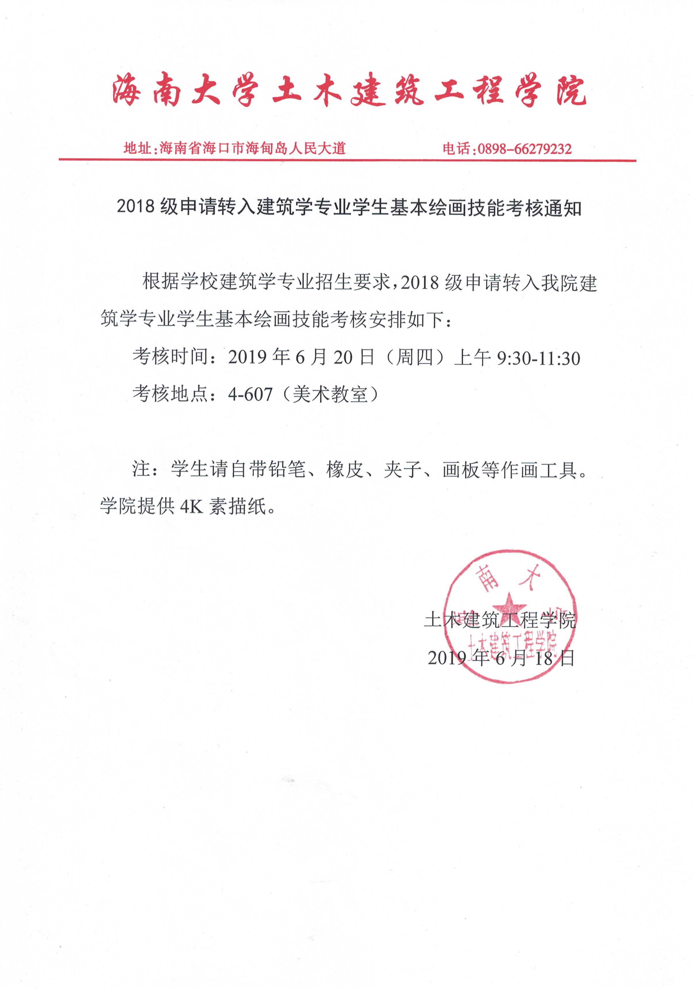 关于2018级学生转入建筑学专业基本绘画技能考核的安排
