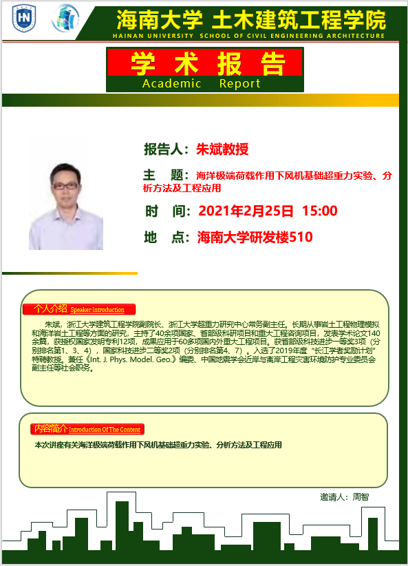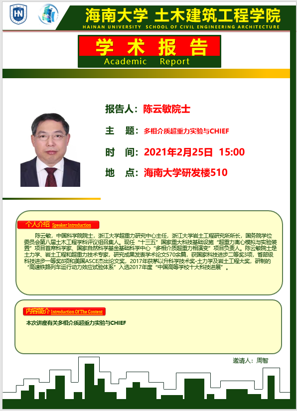 225日(周四)下午300点在海南大学研发楼510,浙江大学陈云敏院士和朱斌教授分别在我院做《多相介质超重力实验与CHIEF》和《海洋极端荷载作用下风机基础超重力实验、分析方法及工程应用》学术报告。请各位老师和在校研究生务必参加,到时会做参会签名,考勤记录。