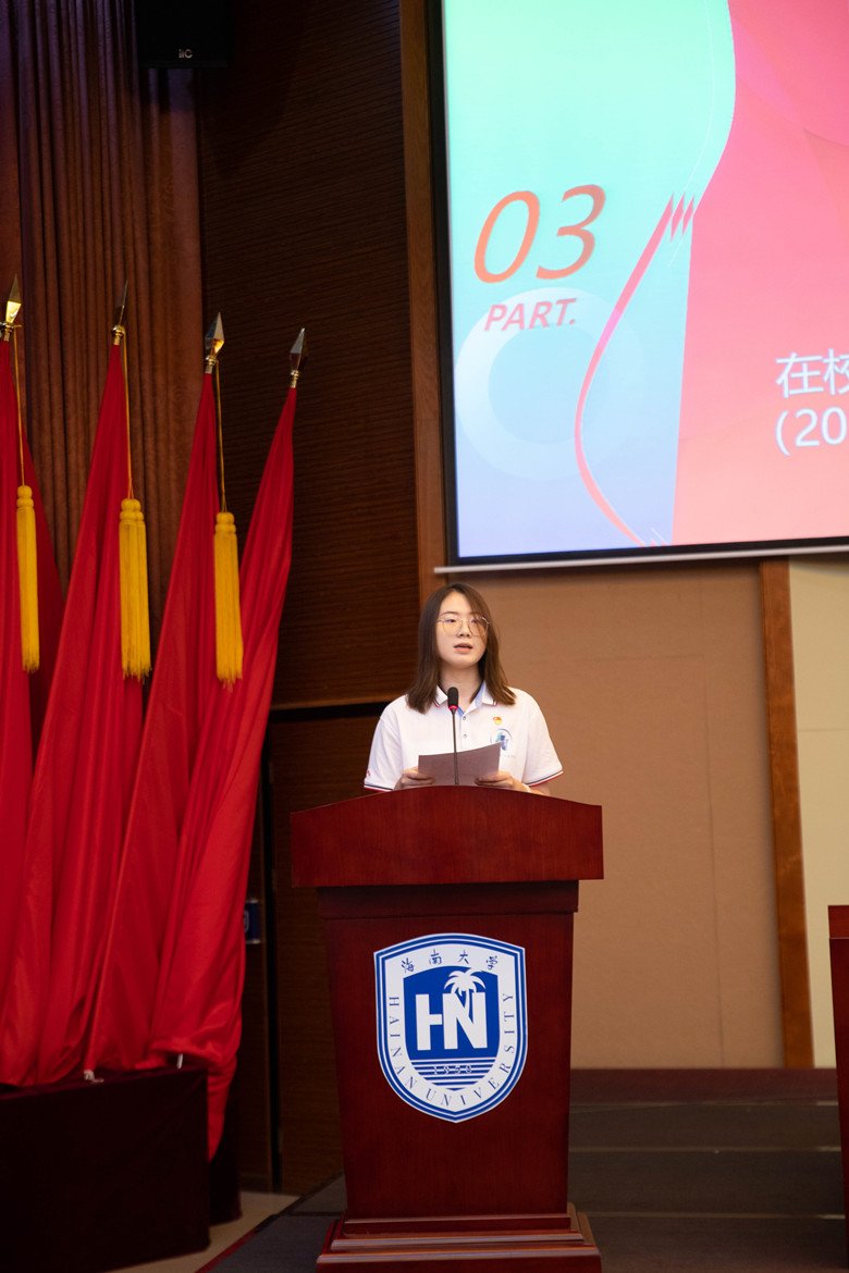 会议第三项,代表发言。2018级土木工程专业学生李明宸作为毕业生代表发言,他表达了对老师、同学、学校的恋恋不舍和感激之情,表示将从脚下这片热爱的土地出发,带着回忆奔赴山海,铭记海大人的家国情怀,不忘初心,坚守理想,做一个对国、对社会、对岗位、对家人、对自己有用的人,做一个大写的“人”。