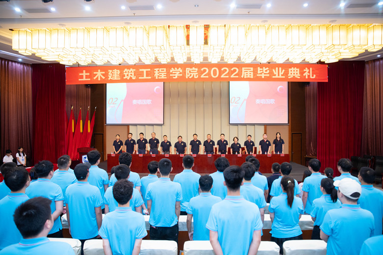 会议第二项,2022届毕业典礼在全体激昂的奏唱国歌声中拉开序幕。