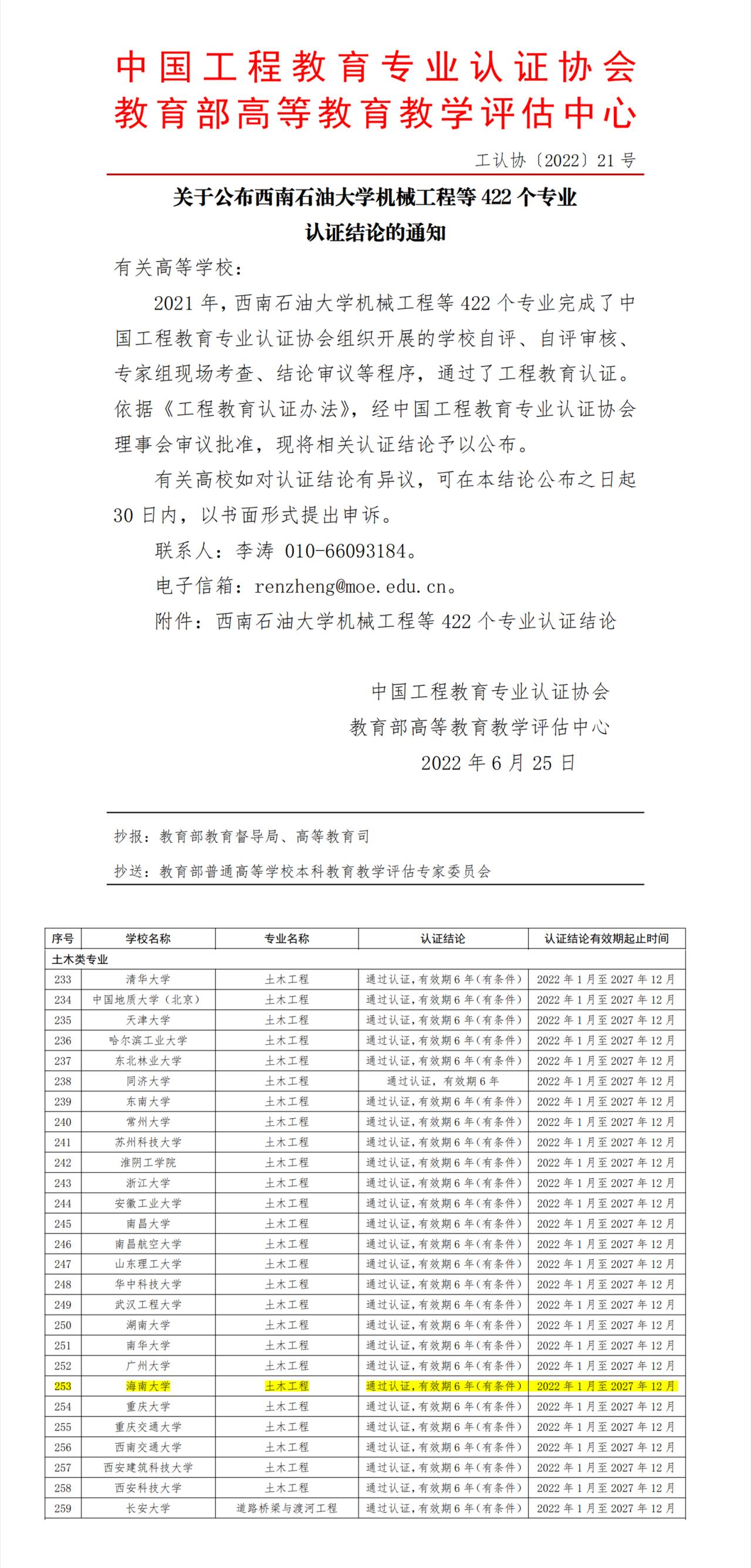 2022年6月25日,中国工程教育专业认证协会、教育部高等教育教学评估中心发布《关于公布西南石油大学机械工程等422个专业认证结论的通知》(工认协[2022]21号)。海南大学土木工程专业顺利通过工程教育认证,认证结论为“通过认证,有效期6年(有条件)”,认证结论有效期起止时间为2022年1月至2027年12月。同时通过认证的有清华大学、同济大学和浙江大学等26所高校的土木工程专业。据悉,该名单还将提交至国际工程教育《华盛顿协议》组织。