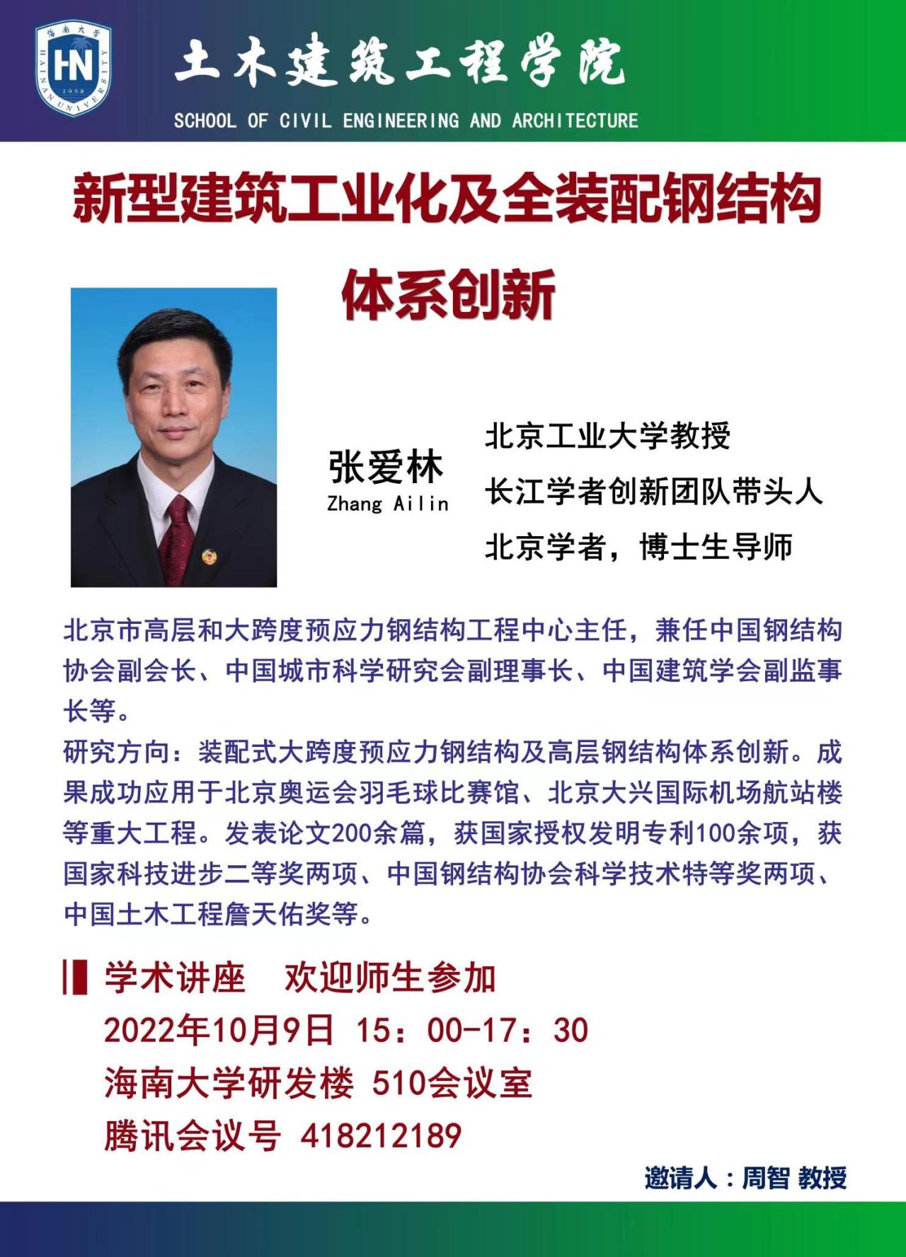 10月9日(周日)下15:00-17:30 点在海南大学研发楼510,北京工业大学张爱林 教授在我院做《新型建筑工业化及全装配钢结构体系创新》学术报告。请有兴趣的老师和研究生通过线上同步方式参加。