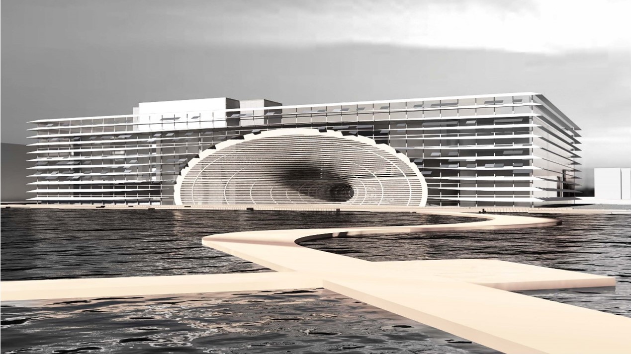 设计位于海大校园西湖东岸,设计者试图运用非线性的设计手法,减小建筑对周边环境的影响,增加建筑的亲水性,从而增加建筑的趣味性,成为学生们的又一活动场所,从而达到活化场地的目的。设计者将山水的意境在建筑中重现,表达了出“城头暮鼓休催客,更值横江弄月归”的美好愿景。
