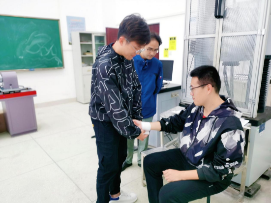 实验中心准备了药品急救箱,并组织学生进行了模拟机械伤害导致外伤的应急包扎过程演练。