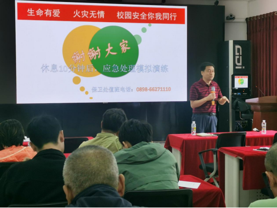 本次培训我实验中心特邀请海南大学保卫科负责校园安全的王智科长前来李运强实验楼508进行消防知识培训授课,我实验中心全体教职工和参与实验室操作的研究生们均参加了此次培训消防安全知识培训。此次培训采取理论授课与实地模拟现场应急操作相结合的方式进行。